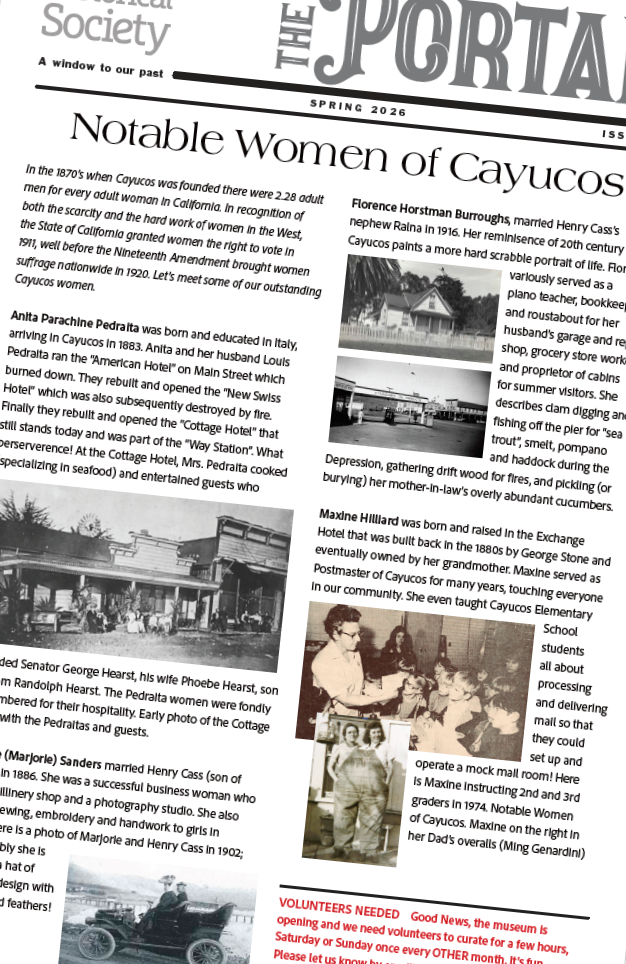 The Cayucos Historical Society is a not-for-profit, 501c3 organization to preserve our local history.